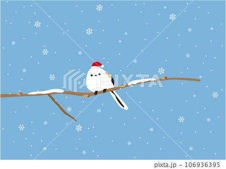 雪が降る中、木の枝に止まっている一羽のシマエナガのイラスト