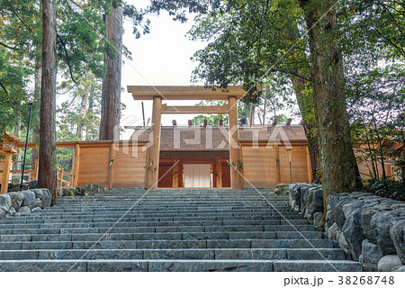 伊勢神宮の内宮の風景 真新しい正宮 遷宮行事 輝く檜の神殿