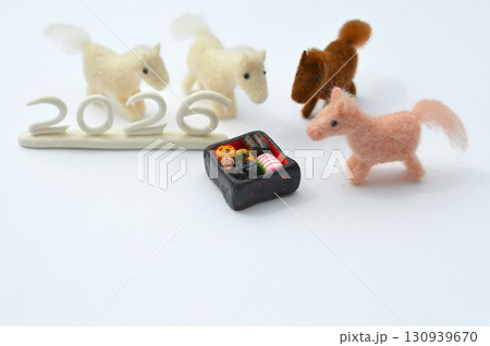 羊毛フェルトの馬とおせち料理の年賀素材