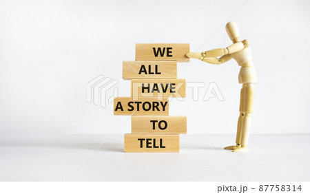 We all have a story to tell symbol. Wooden blocks with words 'We all have a story to tell'. Businessman model. Beautiful white background. Business, popular quotation concept. Copy space.
