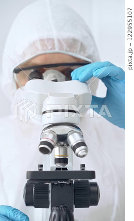 Scientist in ppe analyzing samples with microscope. Close-up of a focused researcher in a lab coat and protective gear using a microscope in a laboratory setting