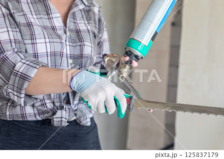 Close-up of a Caucasian woman's hands making genuine leather belts in a workshop.