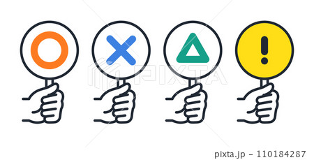 マル・バツ・三角、正解・不正解などの判定札・回答札を持つ手カラー
