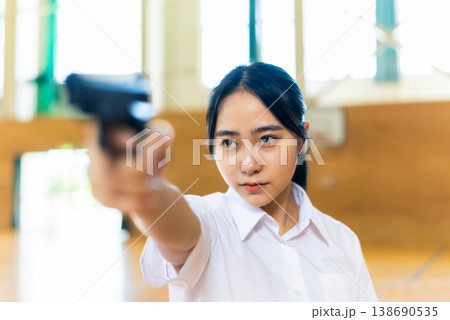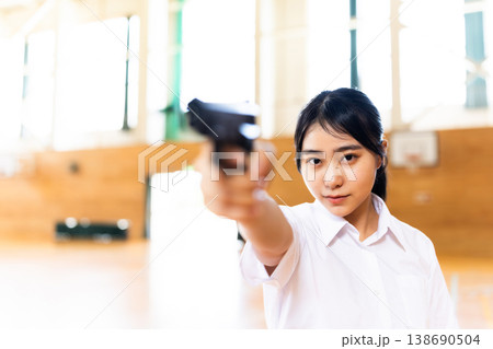 体育館で銃を構える女子高生