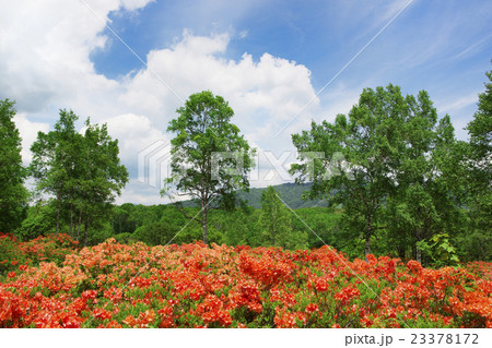 白樺の木にレンゲツツジ咲く新緑の武尊牧場