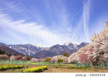 山梨県北杜市 真原の桜並木 桜と八ヶ岳がある風景
