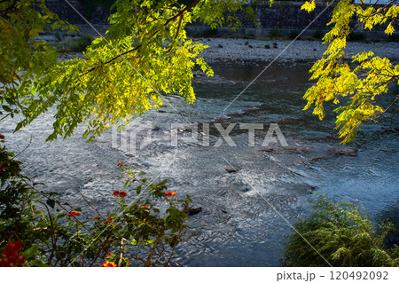 武庫川べりの柔らかな日差しと紅葉、11月8日、宝塚市、日本
