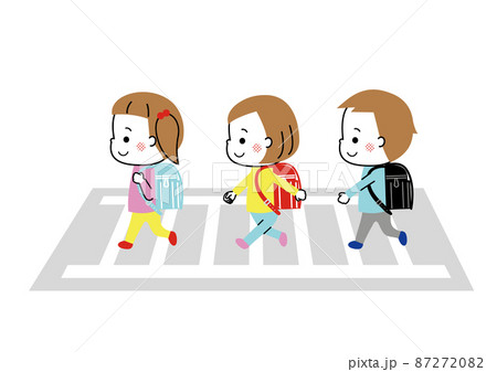 ランドセルを背負って横断歩道を渡る三人の小学生 登下校