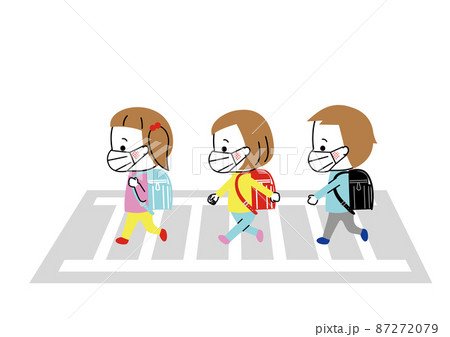 マスクをして横断歩道を渡っているランドセルを背負った三人の小学生