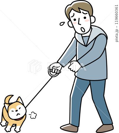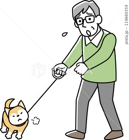 散歩を嫌がる犬と困る飼い主のシニア男性