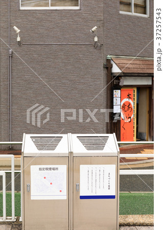 日本の横浜都市景観 横浜駅・横浜タカシマヤ前の喫煙所の外壁に貼られている「ポイ捨て禁止」…