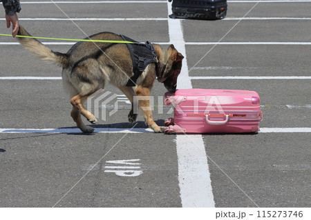 爆発物の探知訓練をする警備犬 荷物の匂いを嗅ぐ警備犬
