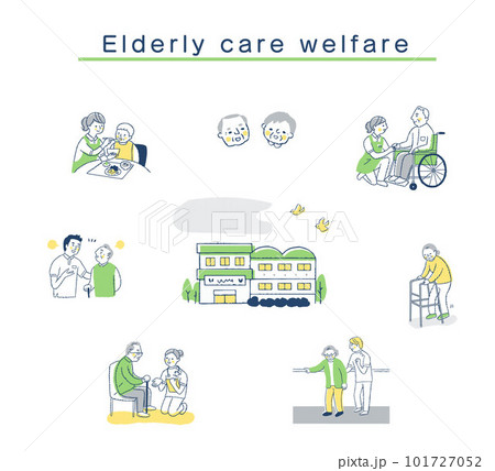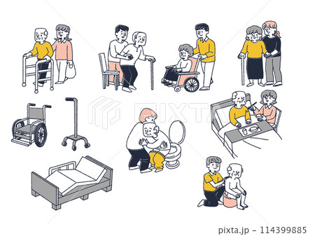 高齢者のお世話や介護 ラインアイコンセット カラー