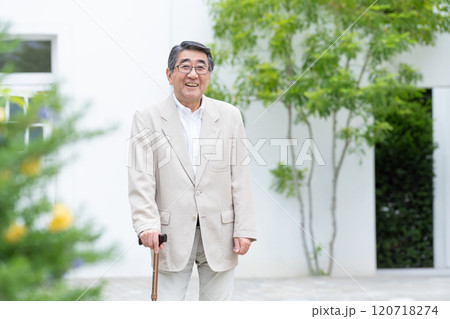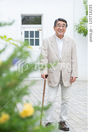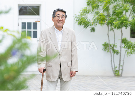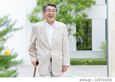 杖をついて歩くシニアの男性