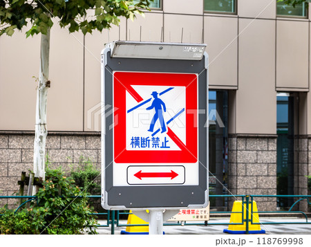 歩道に設置された横断禁止の標識 【規制標識(332)歩行者等横断禁止】