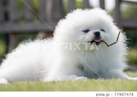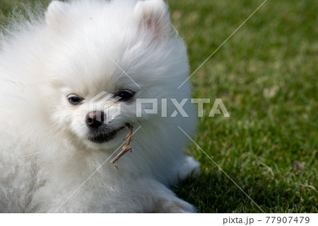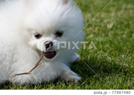歯がゆい白いポメラニアン