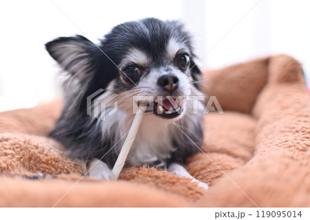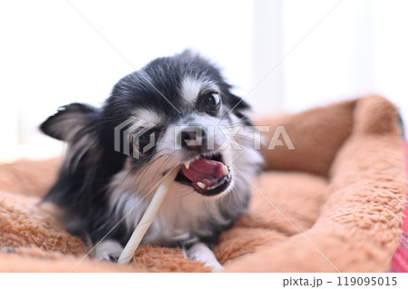スティックタイプの歯磨きガムを噛む犬 ロングコートチワワ