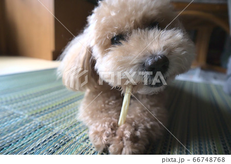 トイプードル怖い顔 トイプードルが夢中になってガムを噛んでいる様子 犬の口元 顔の表情