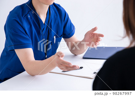 病院・整骨院・整体院であごの痛みで悩む患者を診察・問診・カウンセリングする女性医師・看護師