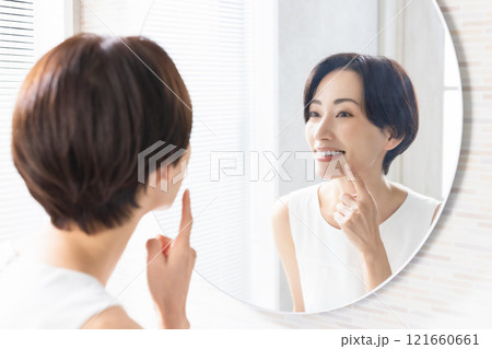 鏡を見る女性 口元