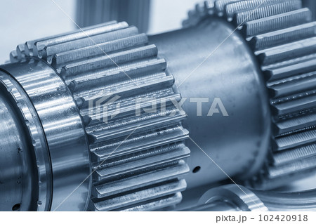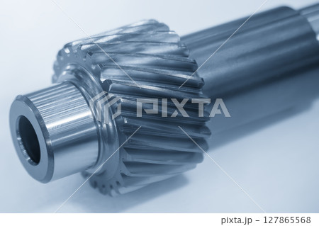 Close-up scene of transmission gear spare parts in the light blue scene.