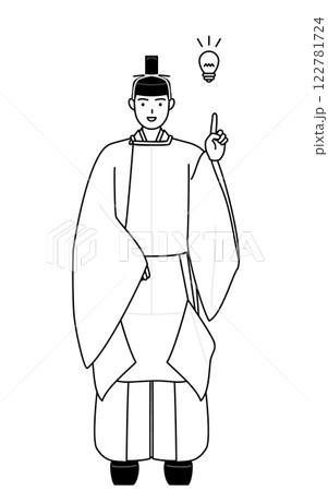 DXのイメージ、業績と売上の向上を案内する神社の神主、冠と斎服姿