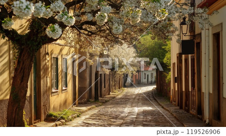Picturesque view of a cobblestone street lined with flowering trees in a serene village setting, bathed in golden sunlight