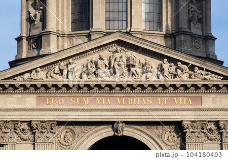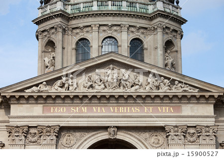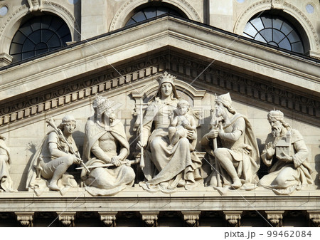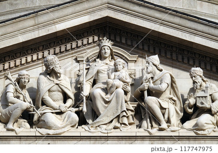Tympanum bass relief showing the Virgin Mary and Hungarian saints, St. Stephen`s Basilica in Budapest, Hungary.