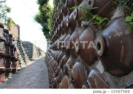 壁面に焼酎瓶と土管が敷き詰められた道(常滑焼 愛知県 常滑市)