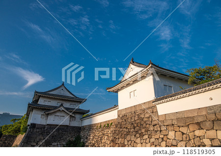 西日に照らされる大阪城千貫櫓と多門櫓