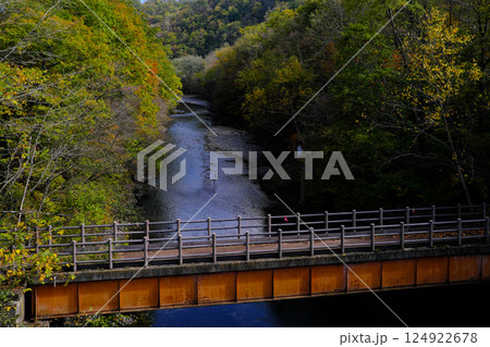秋の渓谷と小さな橋の風景