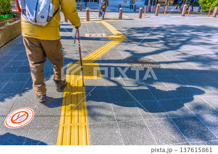 日本の横浜都市景観魔の凹凸…障害物にも、安全を守ることにも…高齢化社会…杖の高齢女性…冬至で冷え込む