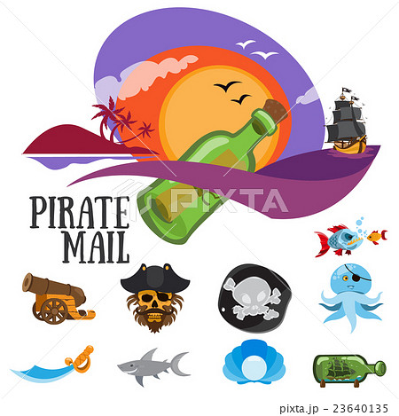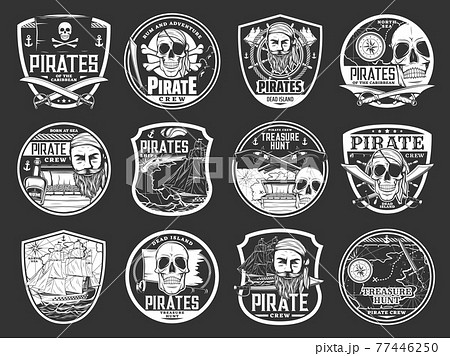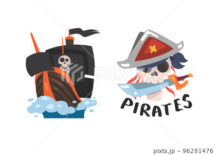 Pirate Skull in Hat with Saber and Ship with Black Flag Vector Set