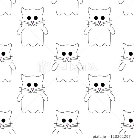 Seamless Pattern with Cute Halloween ghost in costume Cat. Holidays cartoon character on white background. Vector Flat Illustration.