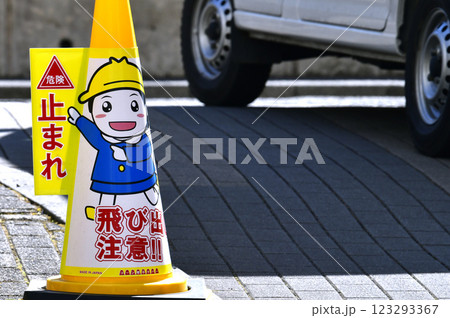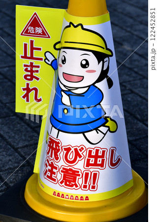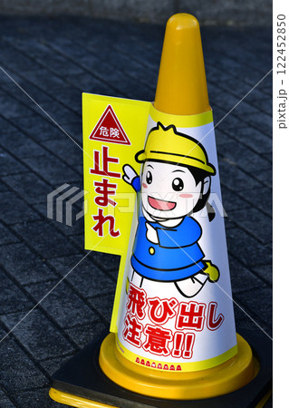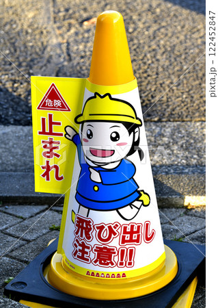 日本の横浜都市景観 危険 止まれ 飛び出し注意!!のコーン標示が2日、登場した=2日、横浜市内