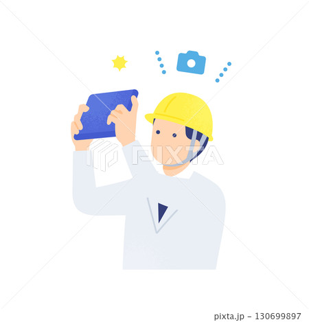 タブレットを使い建設現場で写真撮影や測量を行う現場監督
