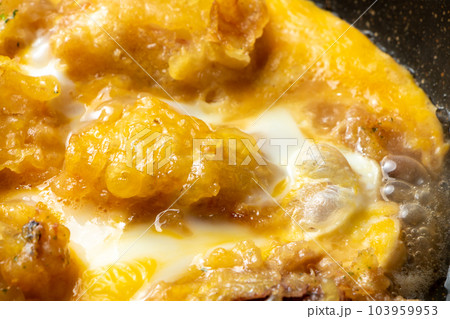 天ぷら(たこ)卵とじ調理シーン。残り物の揚げ物リメイクイメージ。