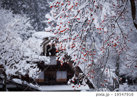 新潟県小千谷市 赤い柿の実が残る雪景色