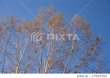 杉の枝の間から青空に残月が浮かんでいる風景を撮影