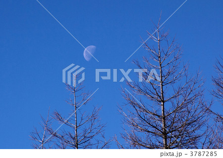 冬の残月、夜明けの空に月が残り着雪の木々との冬風景