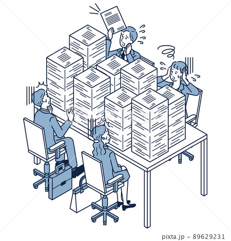 紙書類が山積みで困っているオフィスのビジネスパーソンたち