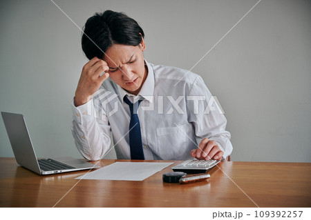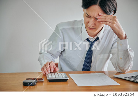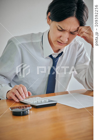 しかめっ面の表情をしながら電卓で計算をする若い男性