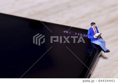バッテリー残量不足のスマートフォンと読書する男性