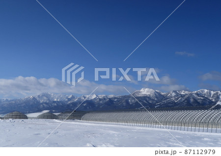 雪に覆われた田園風景 芦別岳と富良野スキー場を望む