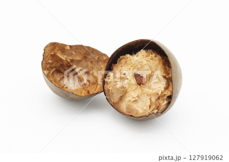 白背景に無造作に並べれた複数の羅漢果と割れたその中身