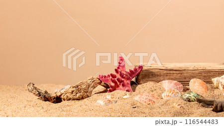 Abstract summer beach scene with a composition of sea sand and shells on a beige background.