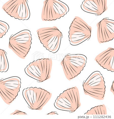 Scallop seamless pattern in line art style. Undersea background design of seashell. Vector illustration on a white background.