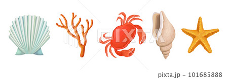 Sea Shell, Crab and Coral as Aquatic Object Vector Set