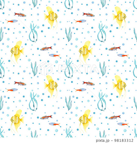Watercolor underwater seamless pattern of angelfishes, neon tetra fishes, seaweeds on white background. Print for design, banner, cards, background, menus, souvenirs, decor, wallpaper, fabric, textile