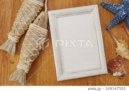 space of photo frame with nautical marine decoration on wooden background